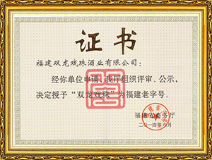 雙龍戲珠酒業(yè)作為福建省白酒研發(fā)中心,榮獲福建老字號產(chǎn)品、福建省農(nóng)業(yè)產(chǎn)業(yè)化龍頭企業(yè)、福建東南窖酒文化館、科技小巨人領(lǐng)軍企業(yè),國家守合同、重信用單位等榮譽(yù)。